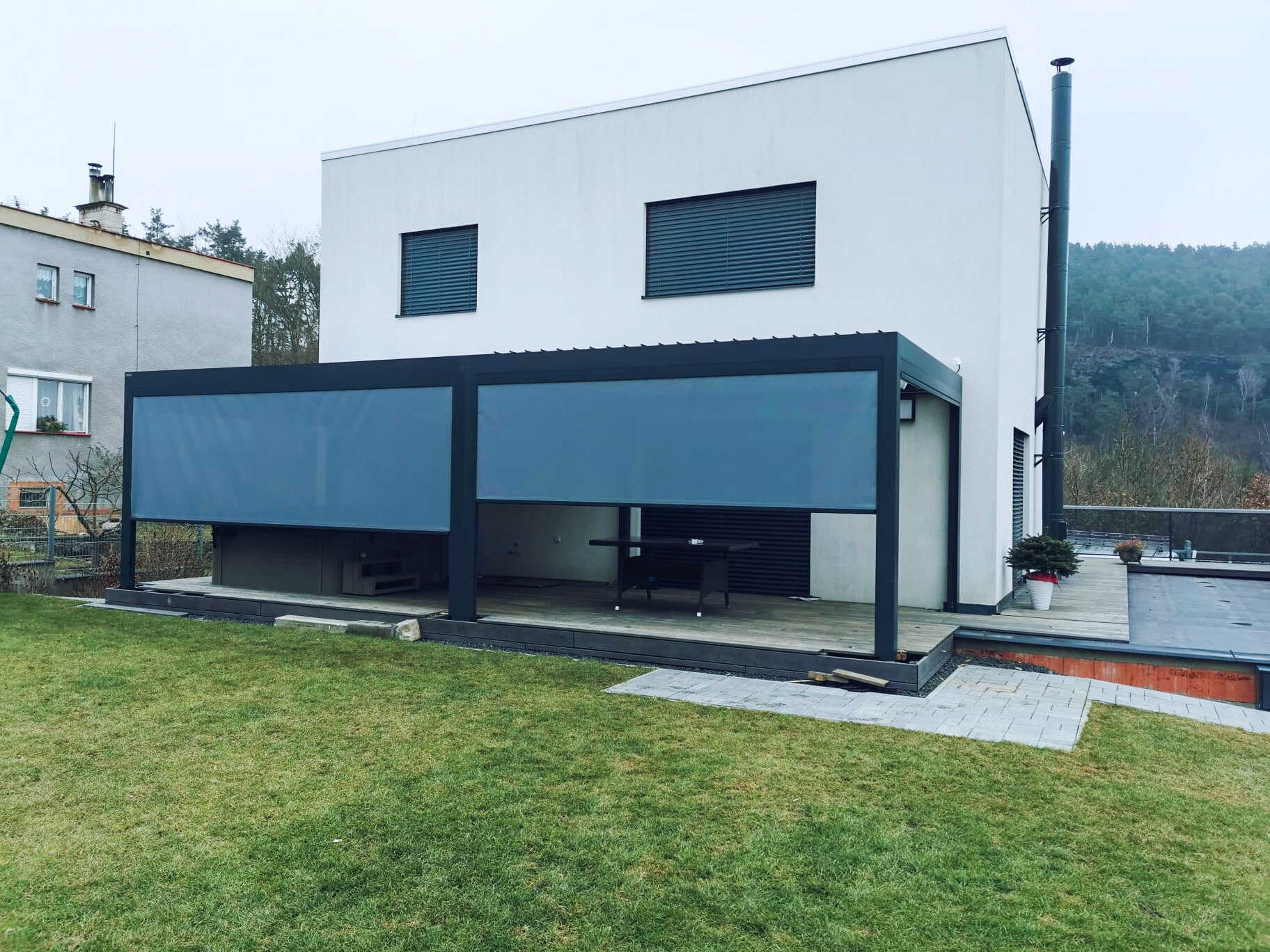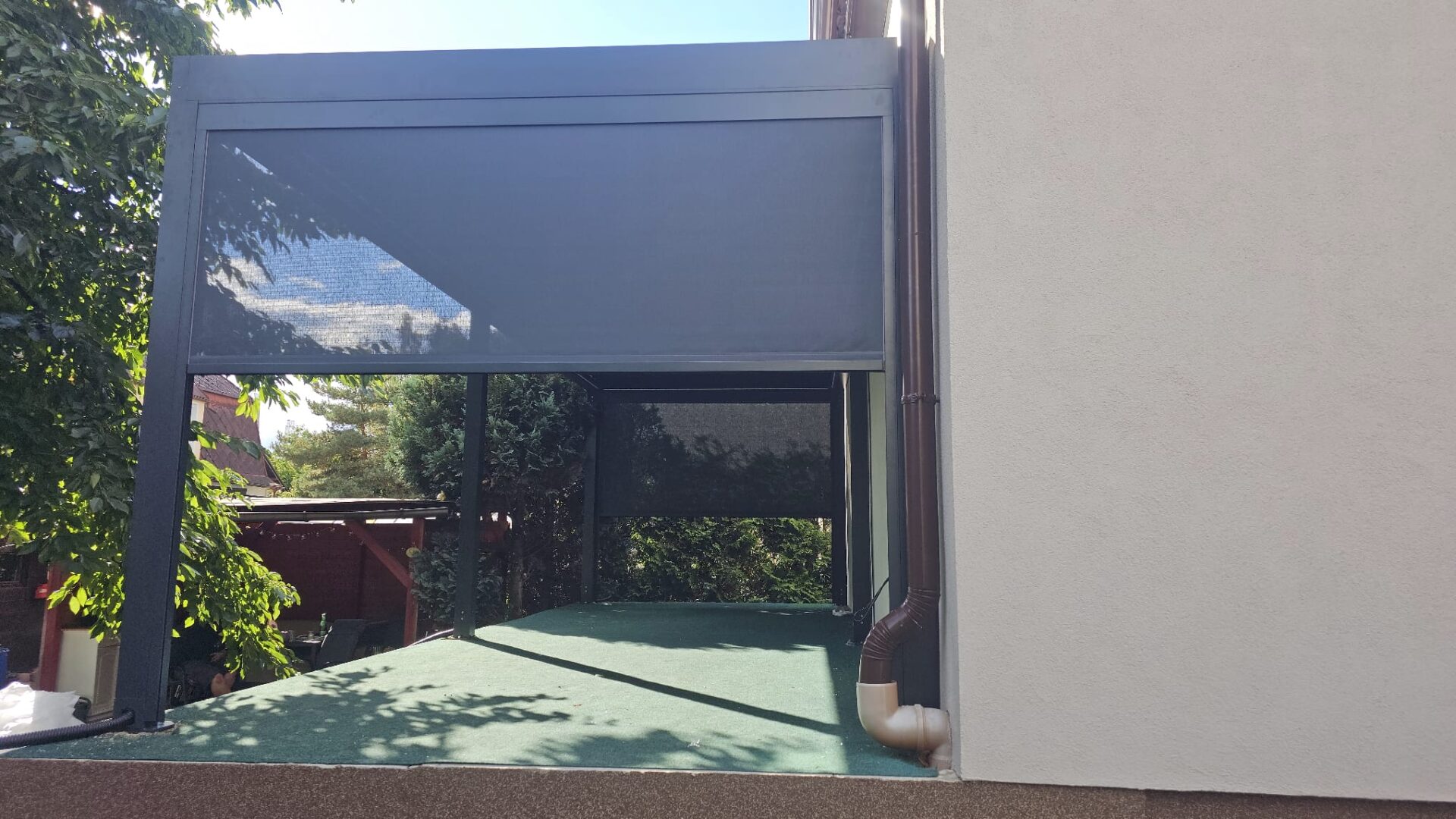 Pro zvýšení komfortu a soukromí lze pergoly doplnit o praktické boční zastínění (např. screenové clony). Nabízíme bohatou škálu barev (antracitová, bílá, hnědá, šedá) a exkluzivní dřevodekory nebo libovolné odstíny dle vzorníku RAL.